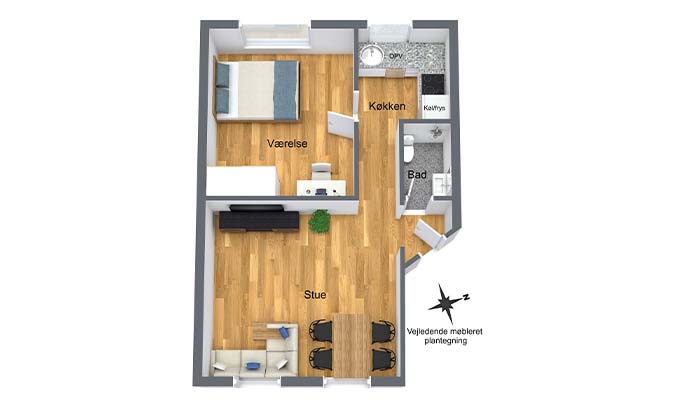 Rummelig stue og soveværelse, begge med samme egeparketgulv som i entre og køkken.
