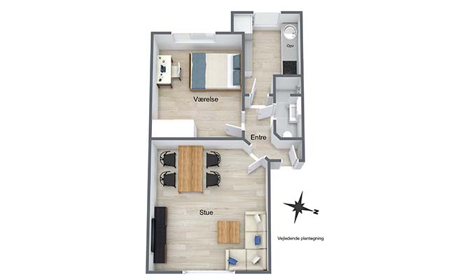 Lejligheden er indrettet med entré/fordelingsgang med adgang til alle rum.