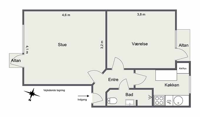 Lejligheden er indrettet med entré/fordelingsgang med adgang til alle rum.