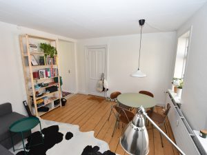Det er svært ikke at lægge mærke til de fine detaljer i lejligheden, herunder de ældre elementer såsom stuklofter, messinghåndtag på alle døre samt det helt nye gulv, der samlet set tilføjer en følelse af elegance og klasse til hele boligen.