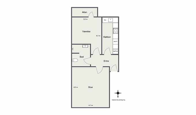 – Nyere køkken med lyse skabselementer , ovn,  emhætte,  opvaskemaskine og   køle-/fryseskab, kombi vaskemaskine/ tørretumbler.